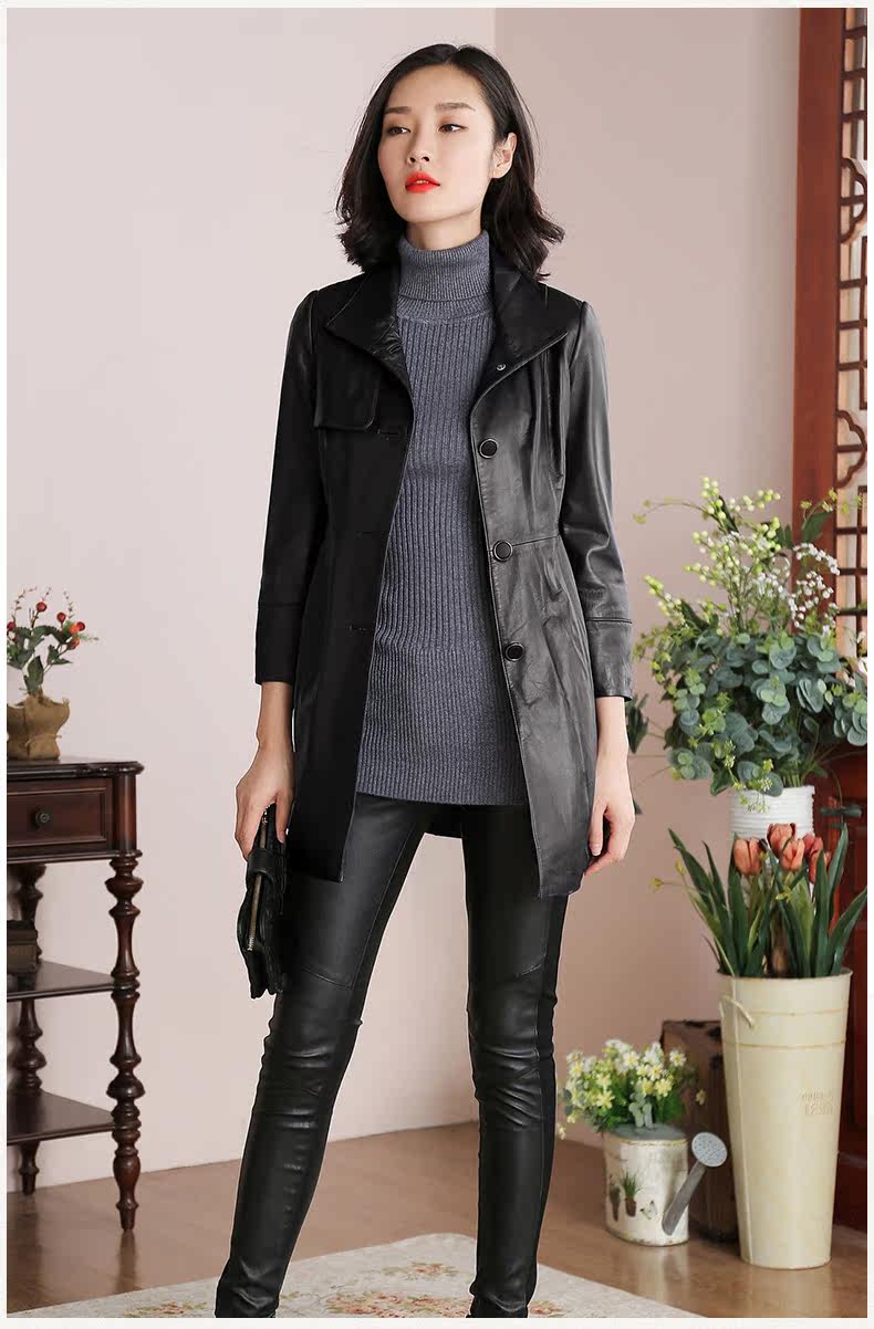易菲2016秋新款西服领修身皮夹克外套女中长款收腰显瘦绵羊皮风衣