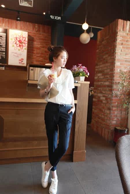 内线2017秋季新款韩版女装 黑色卷边九分OL工装裤 好版型西装裤
