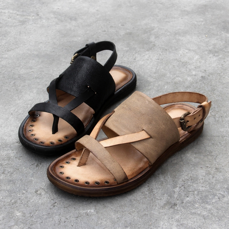 阿马司2018新款夏牛皮真皮文艺复古夹脚凉鞋女平底罗马鞋子