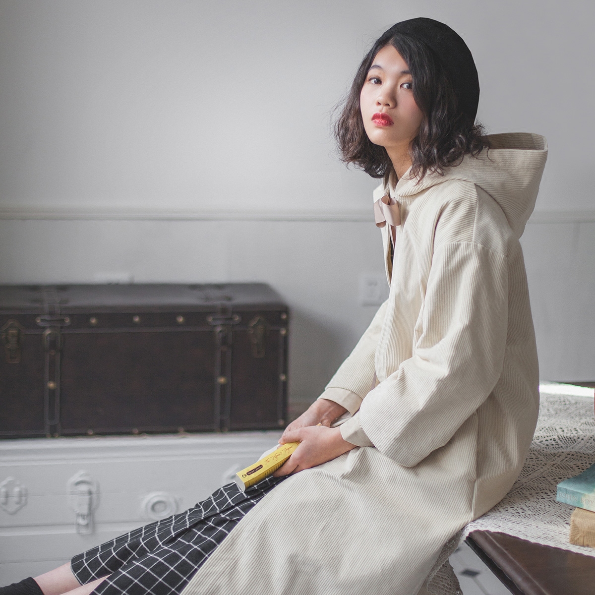 若溯连帽蝴蝶结斗篷风衣2018新款女装春装宽松中长灯芯绒复古外套